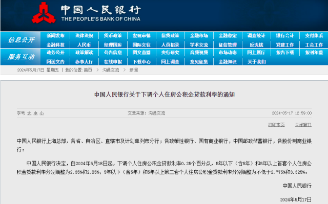 中国人民银行决定,自2024年5月18日起,下调个人住房公积金贷款利率0.25个百分点,5年以下(含5年)和5年以上首套个人住房公积金贷款利率分别调整为2.35%和2.85%,5年以下(含5年)和5年以上第二套个人住房公积金贷款利率分别调整为不低于2.775%和3.325%。
