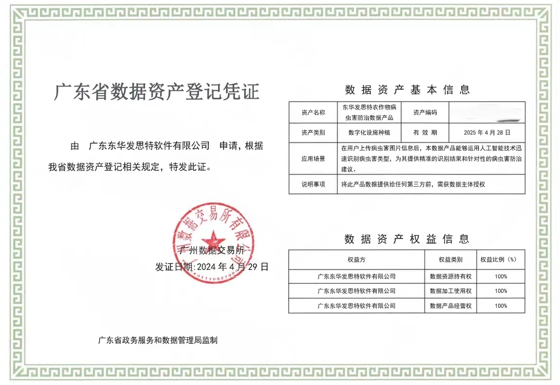 近日,在香洲区政务服务和数据管理局的统筹指导下,广东东华发思特软件有限公司的数据产品“东华发思特农作物病虫害防治数据产品”顺利通过合规审查,获得数据资产凭证,并正式上架广州数据交易所并完成场内闭环交易,成为珠海市首个数据要素×现代农业领域的数据产品,为推动行业领域数字化转型提升提供了有力支撑,也为“百千万工程”走深走实提供了科技赋能。