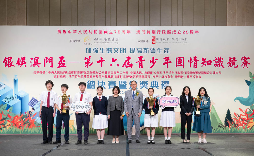 由国情教育(澳门)协会主办的第十六届青少年国情知识竞赛总决赛暨颁奖典礼6日在澳门举行,澳门濠江中学、澳门培道中学和澳门大学分别夺得两个中学组和一个大学组的冠军。