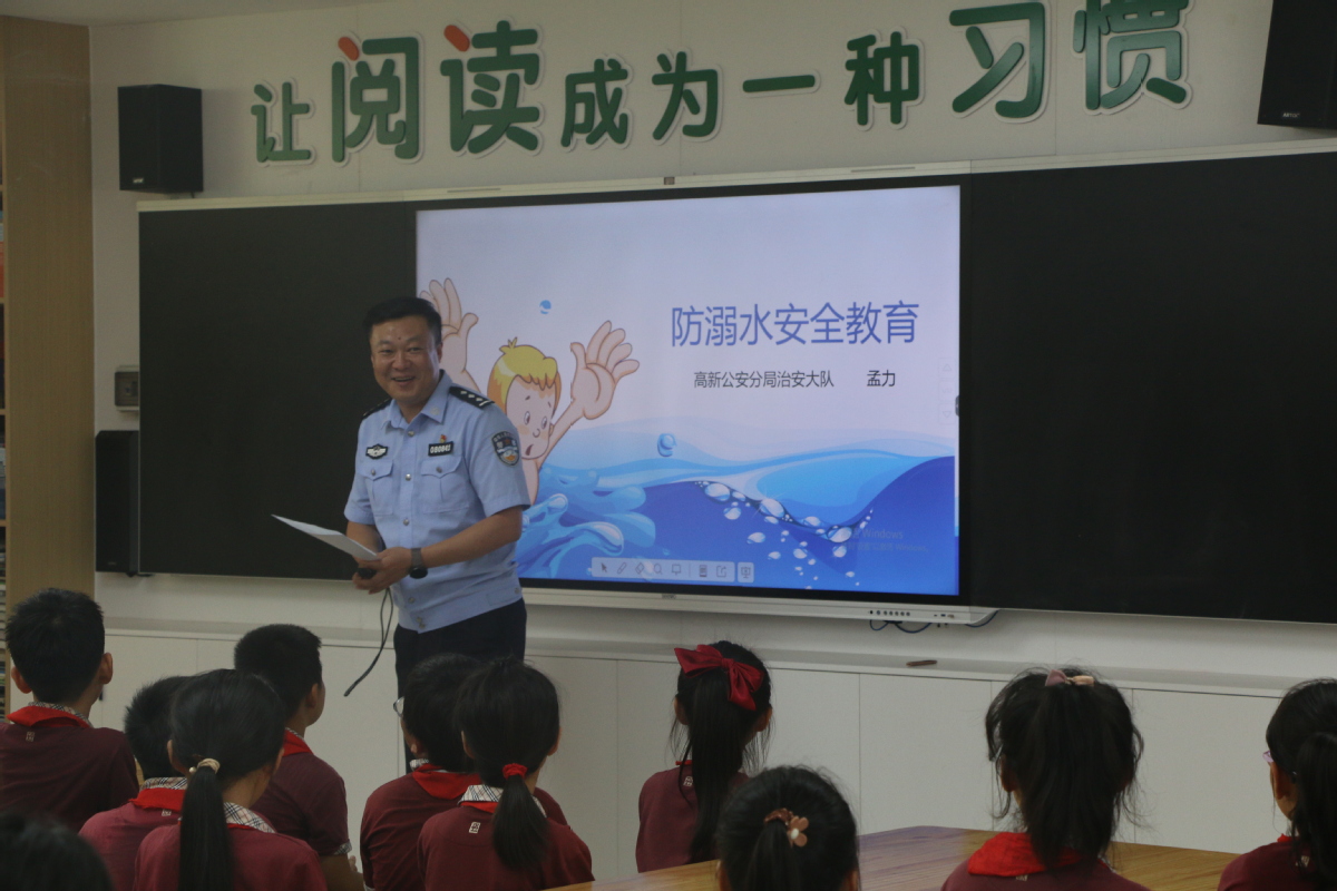 “同学们要切记不可私自结伴游泳、不可在无家长陪同的危险水域游泳……”活动中,高新公安分局治安管理大队民警孟力通过面对面授课的方式,围绕什么是溺水、哪些地方是危险水域、同伴落水如何正确施救、不慎落水如何自救等问题进行生动形象的科学讲解,并结合溺水案例向学校师生介绍了溺水事件的严重性和防溺水的重要性,进一步增强了学生防溺水的意识,掌握自救、施救能力。