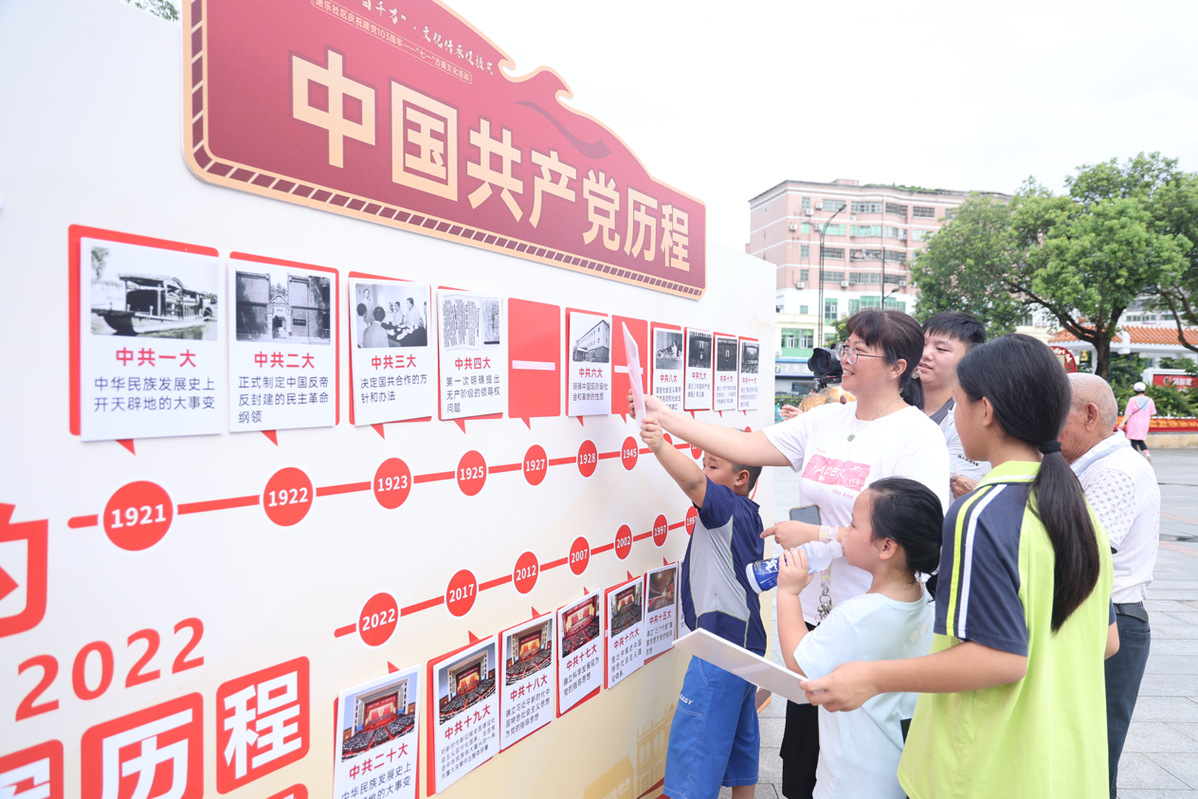 在“红色文化学起来”活动区域,“赓续红色精神,与时代对望”先进楷模事迹展吸引了众多居民驻足观看。“这个我知道,珠海红色三杰,杨匏安、林伟民、苏兆征。”“2022年党的二十大召开,贴这里对了!”从“先进楷模我认识”到“党的声音齐来听”,再到“中国共产党历程”,居民们通过参与各种红色打卡摊位互动,感受到红色精神文化的熏陶。