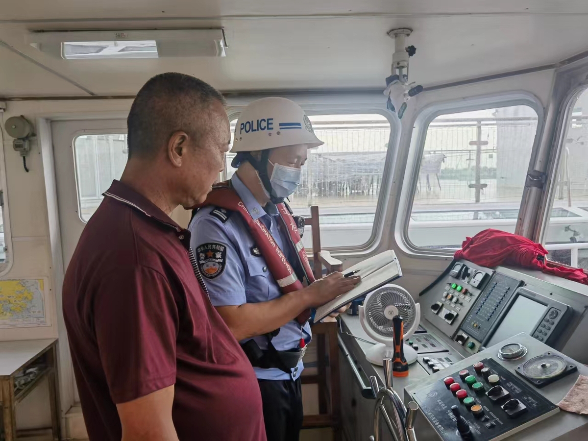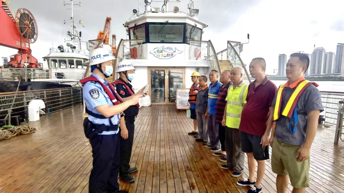7月18日下午15时许,珠海洪湾国际货柜码头泊位处,湾仔边检站执勤民警正为刚靠泊的申请出境船舶快速办理边防检查手续,10分钟后,一艘印有“香港水上的士18”的新造观光游船在边检民警的监护下由中国籍拖轮“中航拖1”驶往香港交付。
