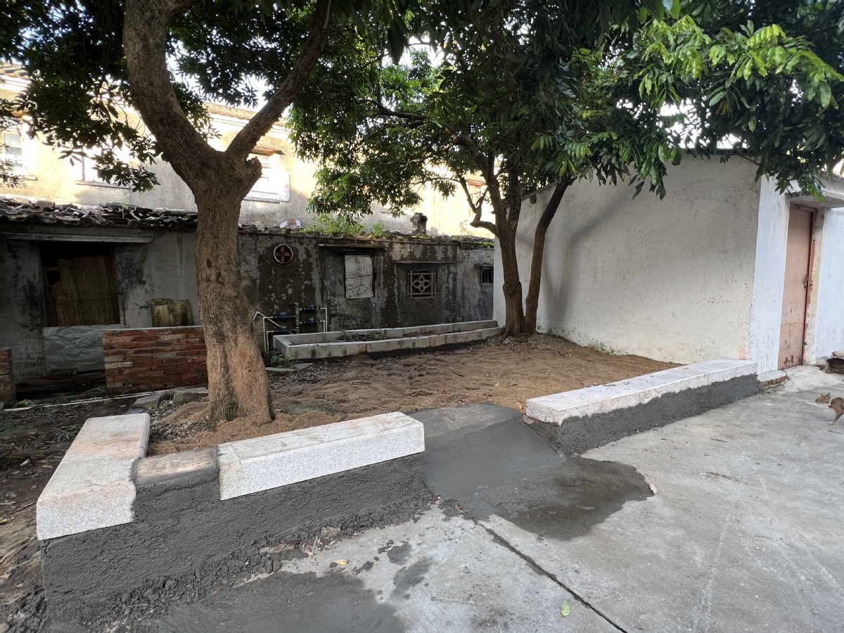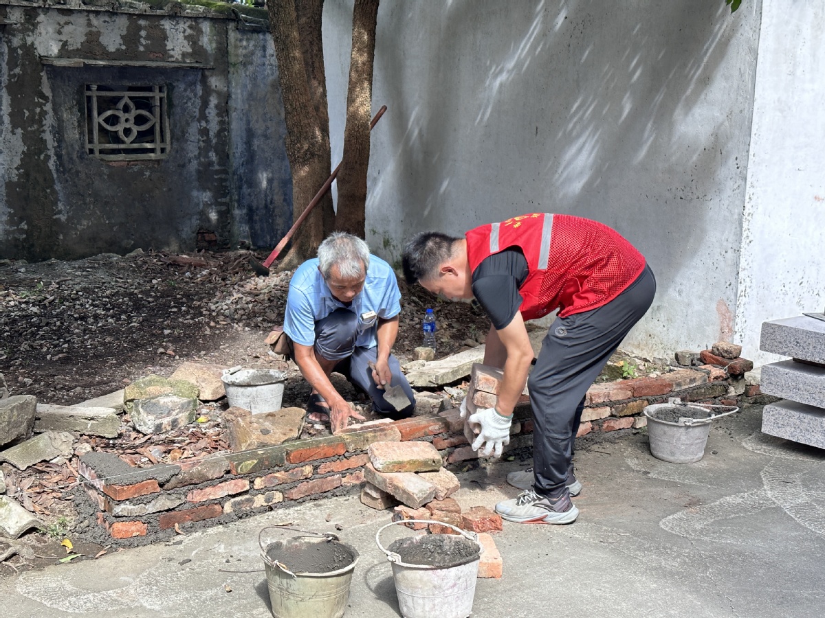 志愿者们纷纷拿起锄头、铁铲等工具,化身为“清洁工”“泥瓦匠”,除去杂草、归类废弃砖瓦、搅拌水泥,利用细线、水平仪等进行规划和设计,清洗墙面、平整地面、砌筑大理石板凳。