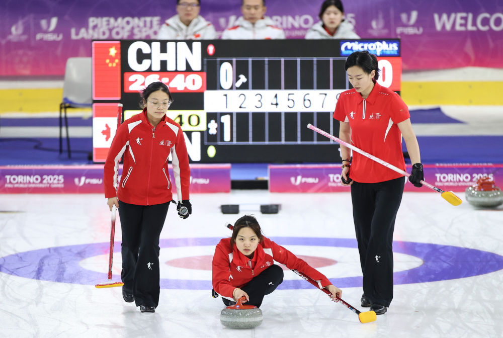 同样在塔佐利冰上运动中心进行的还有冰壶比赛,由北京体育大学学生尹子怡、渠偌萱、谭斯婷、裴君杭、叶紫萱组成的中国女队,先是在白天的比赛中以4:6不敌日本队,随后又在晚间的最后一轮循环赛中以3:6不敌加拿大队,最终以5胜4负的成绩排名循环赛第五,无缘四强。