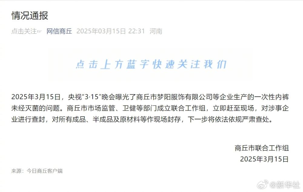 据网信商丘:今天315晚会曝光河南省商丘市梦阳服饰有限公司等企业生产的一次性内裤未经灭菌的问题。商丘市市场监管、卫健等部门成立联合工作组,立即赶至现场,对涉事企业进行查封,对所有成品、半成品及原材料等作现场封存,下一步将依法依规严肃查处。