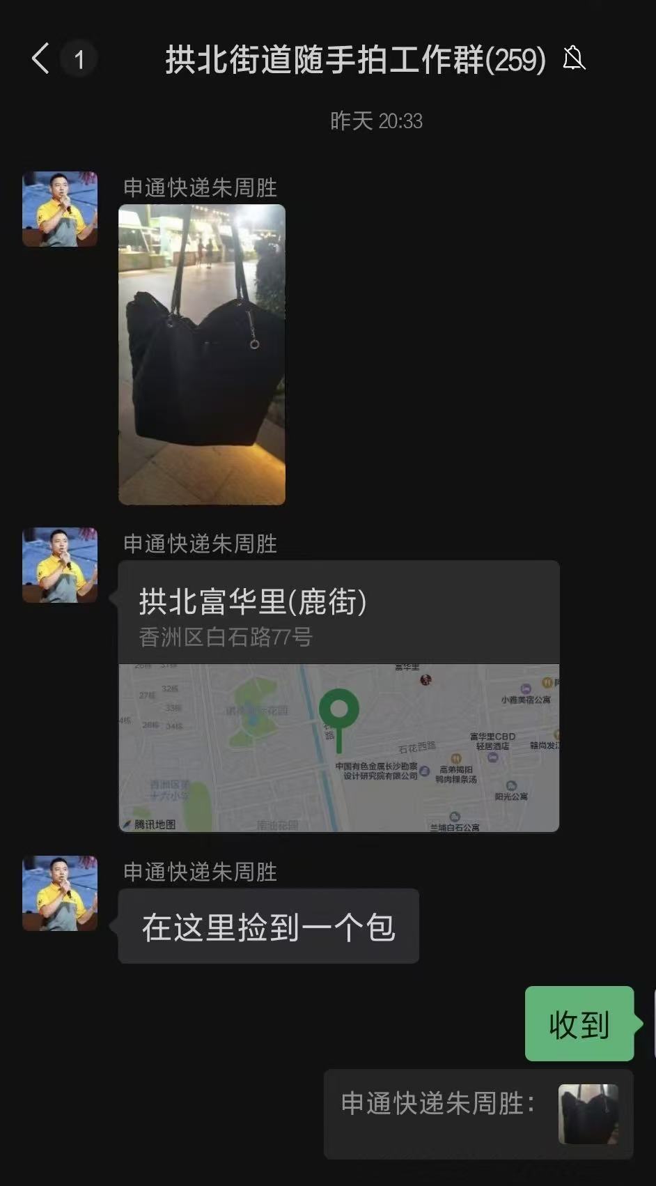 10月7日晚,珠海快递员朱周胜在富华里商业街与朋友相聚时,于人流穿梭的绿化带旁发现一个女性黑色包包。他当即上前捡起,在原地高声询问周边游客是否遗失物品,几番询问无果后,身为桂花社区快递员“随手拍”志愿服务队队长的他,熟练用手机对失物多角度拍照,第一时间将信息上传至拱北街道“随手拍”微信群。
