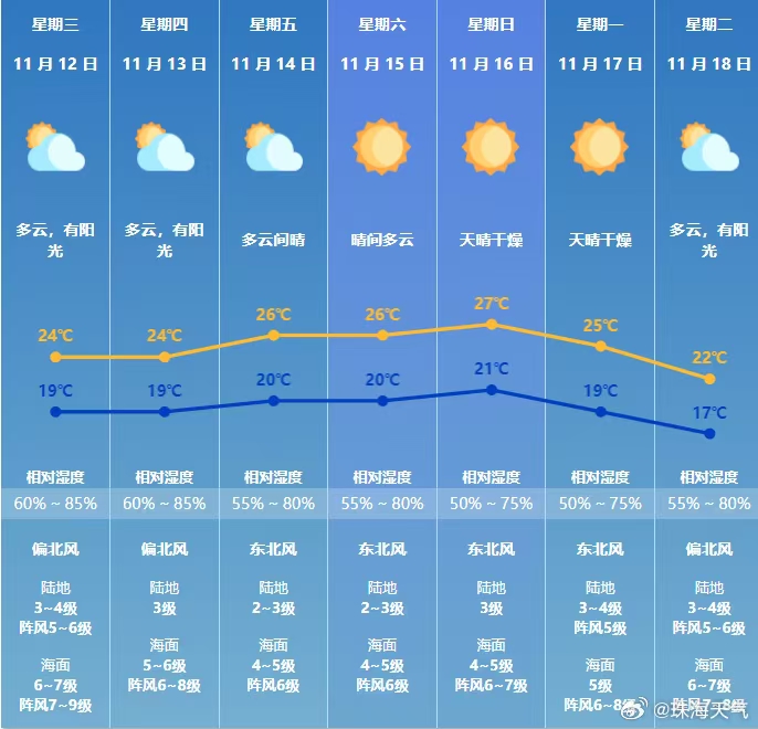 珠海七天天气预报:受“凤凰”外围环流影响,预计12日珠海市多云有阳光,海面风力较大;本周后期多云间晴,气温稍有回升;展望下周初,受新一股冷空气影响,气温下降,北风加大。